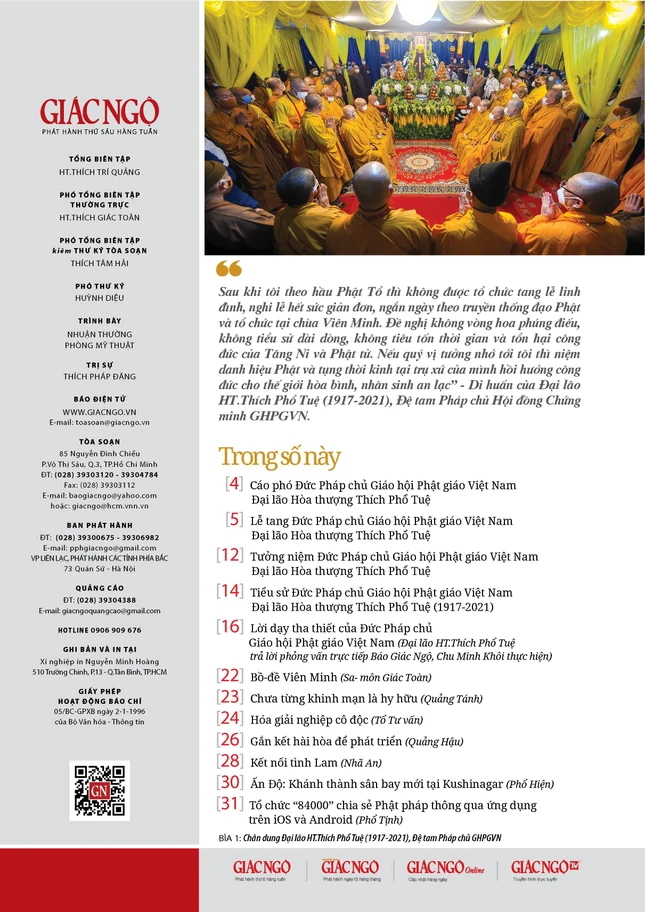 Báo Giác Ngộ số 1125 ra ngày 29-10-2021 trân trọng giới thiệu cùng độc giả bài "Tưởng niệm" của GHPGVN do Trưởng lão Hòa thượng Thích Trí Quảng, Đệ nhất Phó Pháp chủ, Chủ tịch Hội đồng Giám luật - Hội đồng Chứng minh đã đọc tại lễ truy niệm trước lúc di quan Đại lão Hòa thượng Thích Phổ Tuệ nhập bảo tháp trong khuôn viên tổ đình Viên Minh (Hà Nội) sáng 24-10-2021.