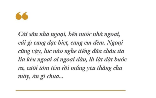 Cái sân nhà ngoại, bến nước nhà ngoại, cái gì cũng đặc biệt, cũng êm đềm. Ngoại cũng vậy, lúc nào nghe tiếng đứa cháu tía lia kêu ngoại ơi ngoại đâu, là lật đật bước ra, cười tóm tém rồi mắng yêu thằng cha mầy, ăn gì chưa.