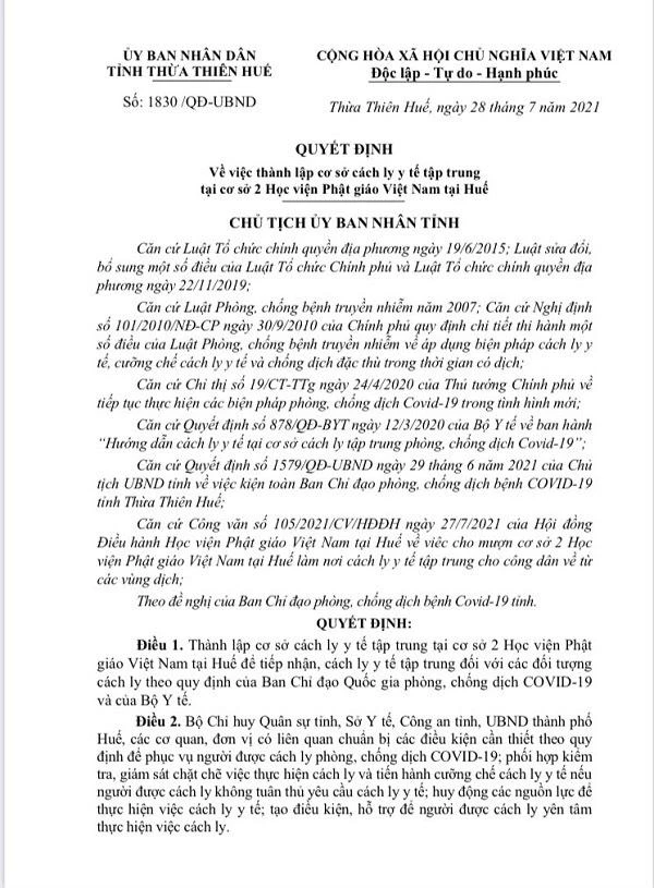 Quyết định của UBND tỉnh Thừa Thiên Huế về việc thành lập trung tâm cách ly y tế ở cơ sở 2 Học viện Phật giáo VN tại Huế |