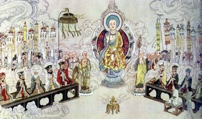 Từ Trung Quốc, Phật giáo truyền đến Triều Tiên. Qua ngõ Triều Tiên, Phật giáo truyền vào Nhật Bản đầu thế kỷ thứ VI TL. Trước khi Phật giáo truyền đến Nhật Bản, người dân nơi đây phần lớn tin theo Thần đạo. Họ tôn thờ nhiều vị thần linh.