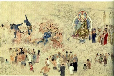 Ngài Địa Tạng nghe thế, tung tấm Cà sa lên không. Tấm Cà sa tỏa rộng bao trùm toàn núi Cửu Hoa. Mẫn Công (Văn Các lão nhân) thấy thế bèn vô cùng hoan hỷ, đem toàn bộ núi Cửu Hoa cúng dường.
