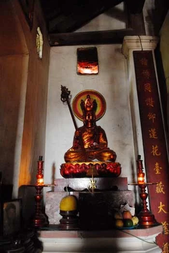 Năm Chí Đức thứ nhất (TL 765), có danh sĩ Gia Cát Tiết, ngụ tại một làng dưới chân núi, hương dẫn các kỳ lão trong làng, lên núi thưởng ngoạn. Đến vùng đất bằng trên núi, thấy những áng mây trôi lững lờ trên bầu trời xanh với ánh nắng chan hòa ấm áp, tiếng suối reo từ khe núi chảy ra nghe róc rách, tiếng chim hót líu lo khiến cho mọi người bị phong cảnh tú lệ làm mê hoặc, đi dần vào rừng sâu, chợt thấy có một vị Thiền sư Tọa thiền trên mõm đá bên cạnh dòng suối, đang nhắm mắt nhập định. Bên cạnh là một cái đảnh cổ gảy một chân, trong đó có một ít gạo trộn lẫn đất trắng.