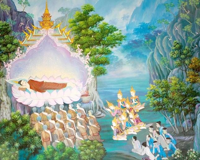 Như vậy, dù Đức Phật có thị hiện vào Niết-bàn, nhưng vẫn không rời Pháp thân đang hiển hiện. Hành giả nếu không kẹt trên tướng mà ở trong Pháp thân kia, sẽ tự thấy ra: Dù có thị hiện đến đi, nhưng vẫn chưa từng đi đến sinh diệt bao giờ.