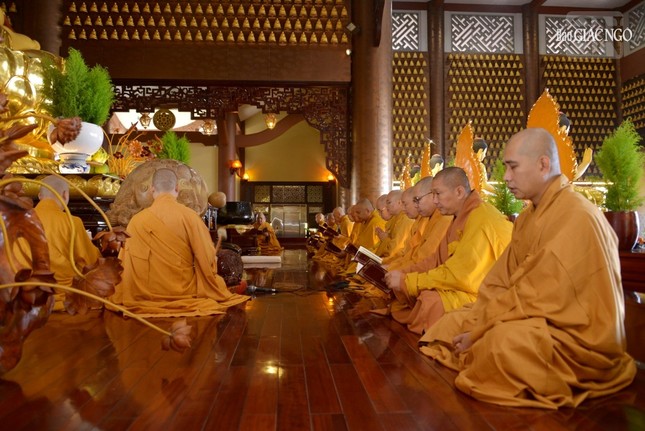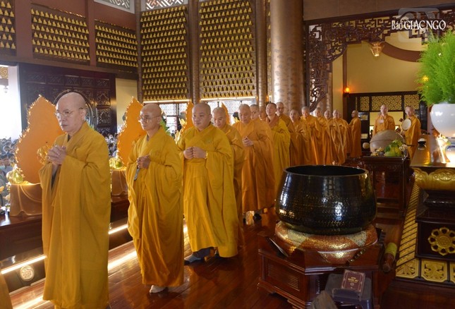 Hòa thượng Thích Lệ Trang, Trưởng ban Nghi lễ T.Ư, Trưởng ban Trị sự GHPGVN TP.HCM, trụ trì chùa Huê Nghiêm cùng chư tôn đức Tăng các tự viện thực hiện nghi thức pháp hội.