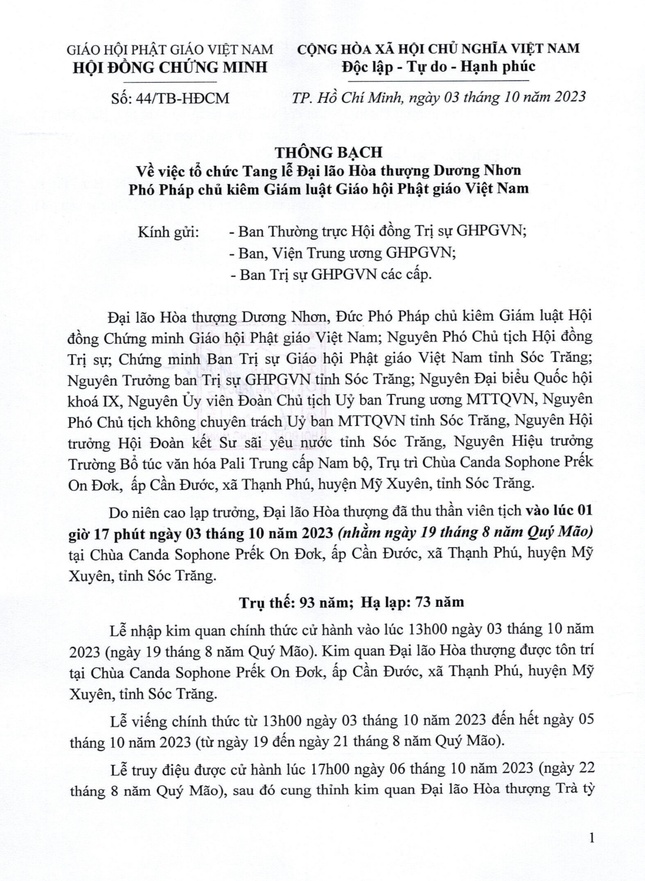 Cùng ngày, Hòa thượng Chủ tịch Hội đồng Trị sự GHPGVN cũng ấn ký cáo phó và thông báo về việc tổ chức tang lễ theo nghi thức cấp cao của GHPGVN.