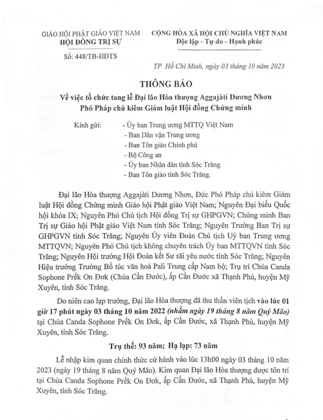 Thông bạch đề nghị Ban Thường trực Hội đồng Trị sự, Ban Trị sự GHPGVN tỉnh Sóc Trăng, các Ban, Viện T.Ư, Ban Trị sự GHPGVN các cấp phối hợp tổ chức trang nghiêm trọng thể tang lễ.