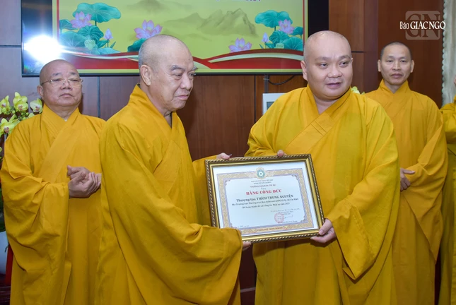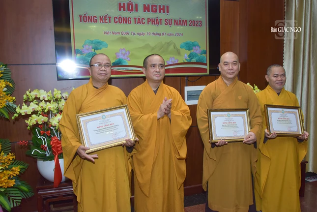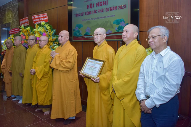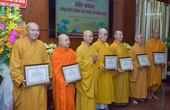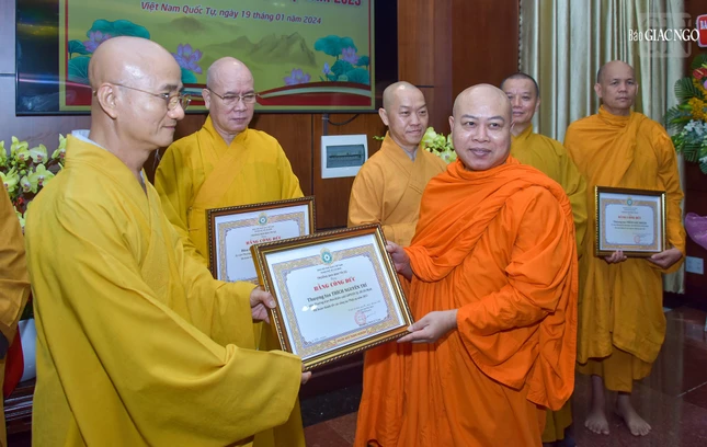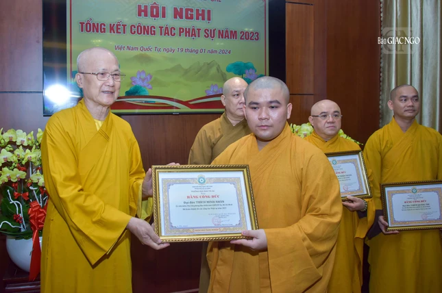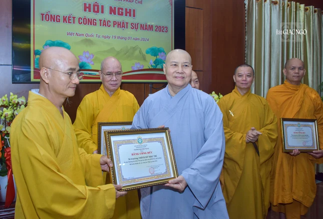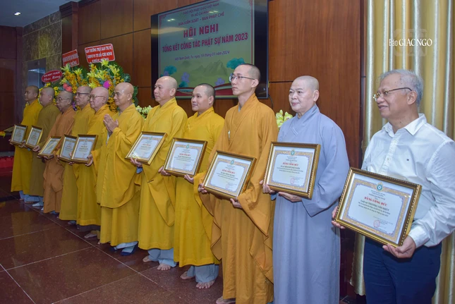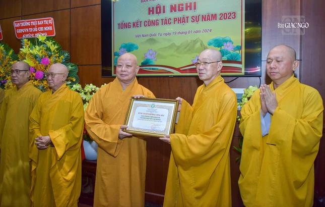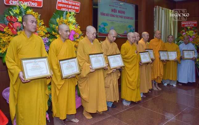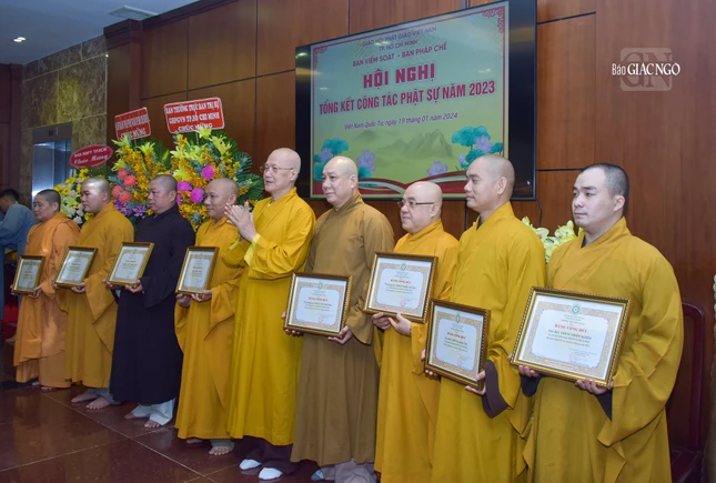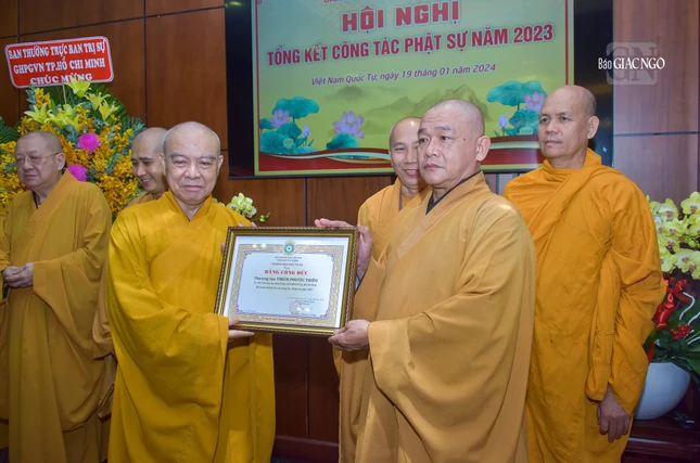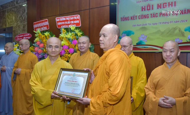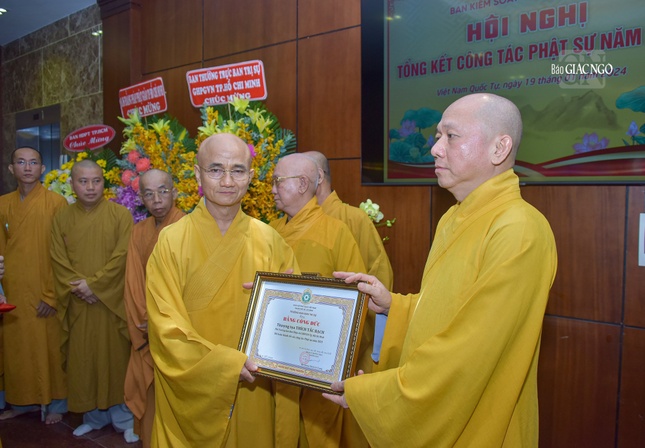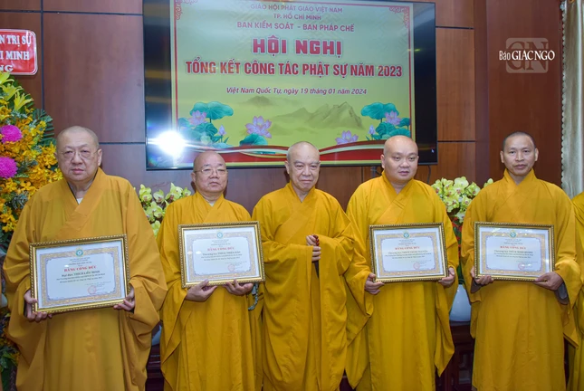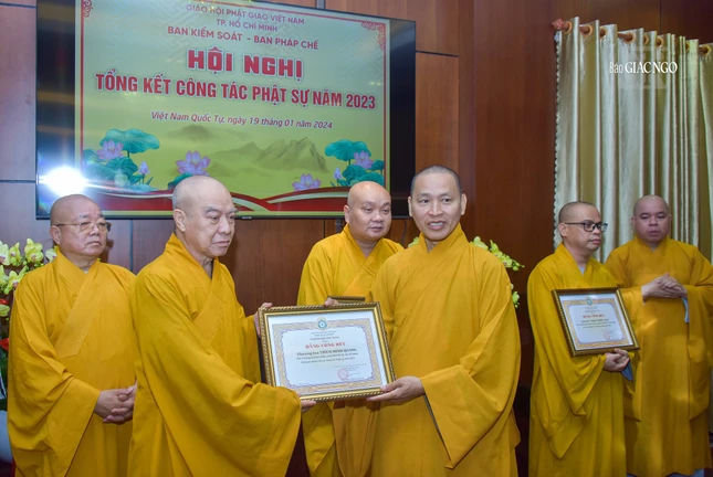 Dịp này, Ban Trị sự GHPGVN TP.HCM đã trao Bằng tuyên dương công đức và công đức đến 35 tập thể, cá nhân thuộc Ban Kiểm soát và 39 tập thể, cá nhân thuộc Ban Kiểm soát có thành tích xuất sắc trong Phật sự năm 2023.