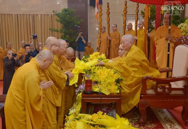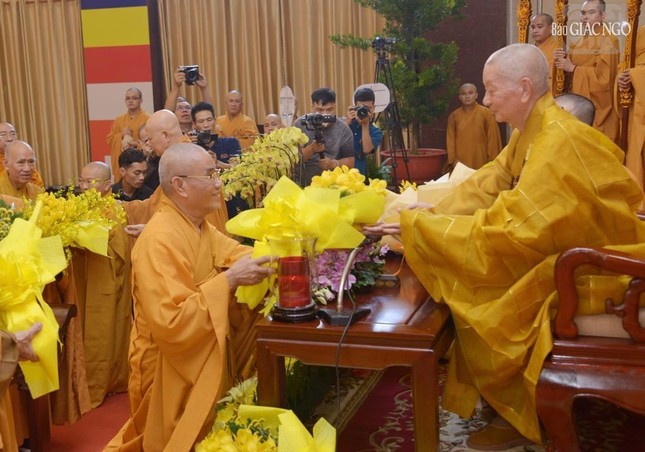Dịp này, chư vị giáo phẩm Thành viên Hội đồng Chứng minh, Hội đồng Trị sự, Ban Trị sự TP, lãnh đạo Ban Tôn giáo TP.HCM, Ban Dân vận Thành ủy TP, Học viện Phật giáo VN tại TP.HCM và các ban, ngành đã dâng hoa cúng dường lên Đức Đệ tứ Pháp chủ GHPGVN.