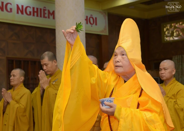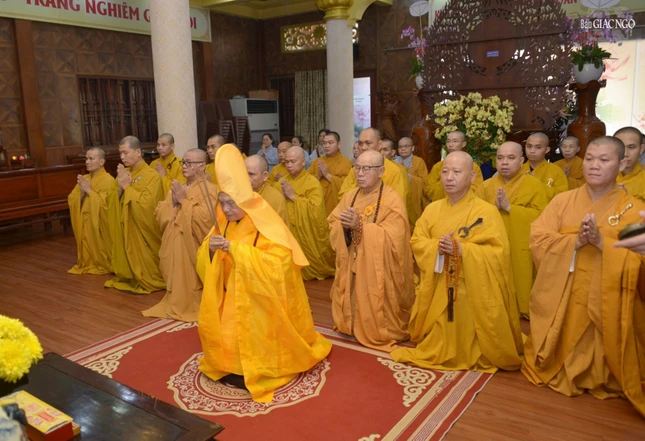 Tiếp đó, trong tiếng đồng thanh trì tụng thần chú Đại bi, Thượng tọa Thích Quảng Chơn, Trưởng ban Nghi lễ GHPGVN TP.HCM, cùng chư tôn đức Ban Nghi lễ Phật giáo TP.HCM, hướng dẫn đạo tràng đồng trì tụng kinh Dược Sư, hồi hướng công đức, nguyện phong điều vũ thuận, quốc thái dân an.