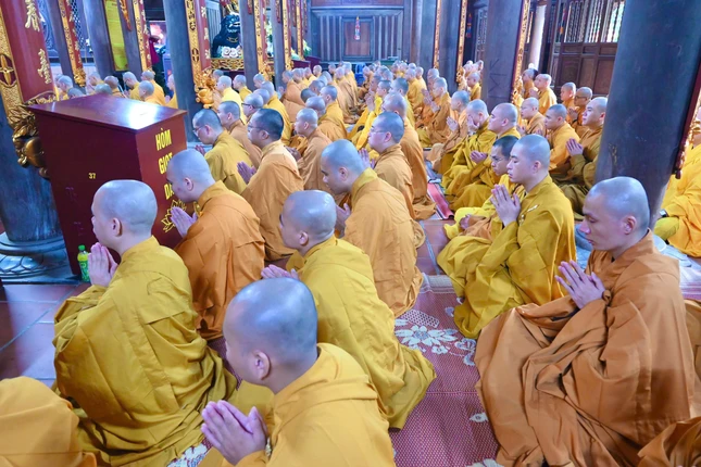 Trước đó, Tăng Ni sinh Học viện đã hành trì bái sám từ mùng 10 đến 13-7-Ất Tỵ. Mỗi ngày 6 thời khóa tụng niệm để sám hối các nghiệp chướng, hồi hướng về tứ ân lục đạo.