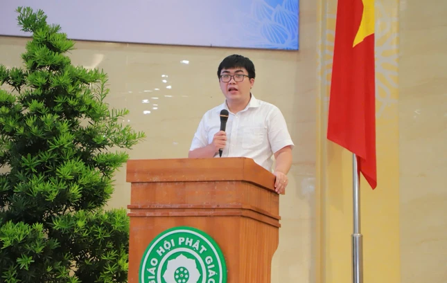 Tại buổi tập huấn, anh Phạm Lê Minh Khang thông tin về nội dung chương trình tập huấn. Chư tôn đức và thành viên Ban Tổ chức đã chia sẻ các chuyên đề tập huấn đến tình nguyện viên.