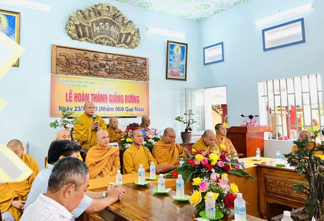Đại đức Thích Thiện Thức, Ủy viên Hội đồng Trị sự, Phó ban kiêm Chánh Thư ký Ban Trị sự GHPGVN tỉnh chia sẻ ý nghĩa của công trình, ghi nhận và tán dương công đức của chư Tăng, Phật tử chùa Long Sơn đã hoàn thành Phật sự quan trọng góp phần cho sự phát triển của Phật giáo tỉnh.