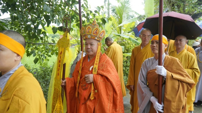 Trong tiếng niệm Phật của chư tôn đức, các Phật tử, tiếng chuông trống trầm bổng ngân vang, đại chúng đã cung thỉnh kim quan nhục thân Ni trưởng rời Giác linh đường đến nhập Bảo tháp trong khuôn viên chùa Phúc Lâm.