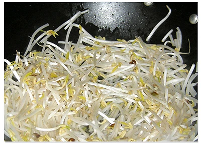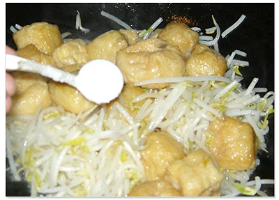 Sau đó đổ giá đỗ vào xào, nêm 1 thìa bột canh, đảo đều,