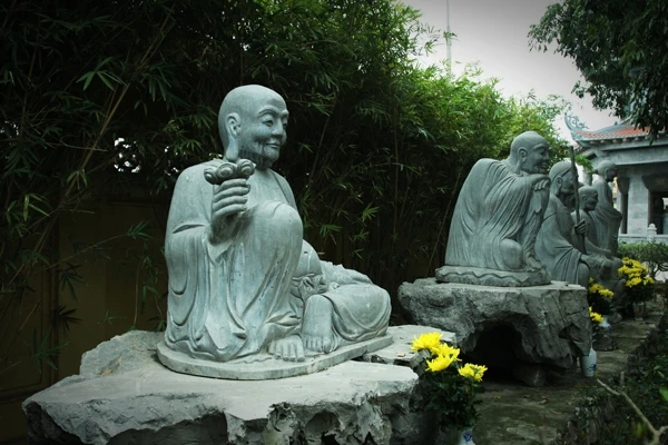 Khi những ấn tượng đối với ngọn bảo tháp còn chưa vơi đi, tôi lại bắt gặp một không gian đậm đà sắc màu Phật giáo, với 18 pho tượng La Hán đặt thẳng hàng, được chạm khắc sinh động, tinh tế.