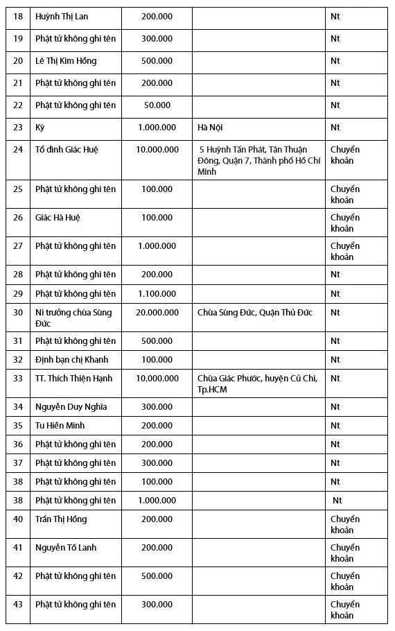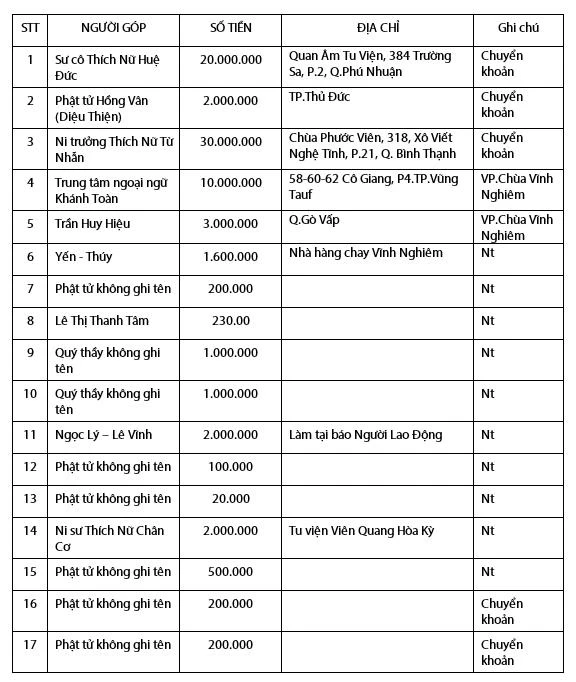 Theo đó, tính đến 19 giờ ngày 10-3-2021, Ban Từ thiện xã hội GHPGVN TP.HCM đã nhận được số tiền 597.670.000 đồng, với danh sách đóng góp cụ thể như sau: