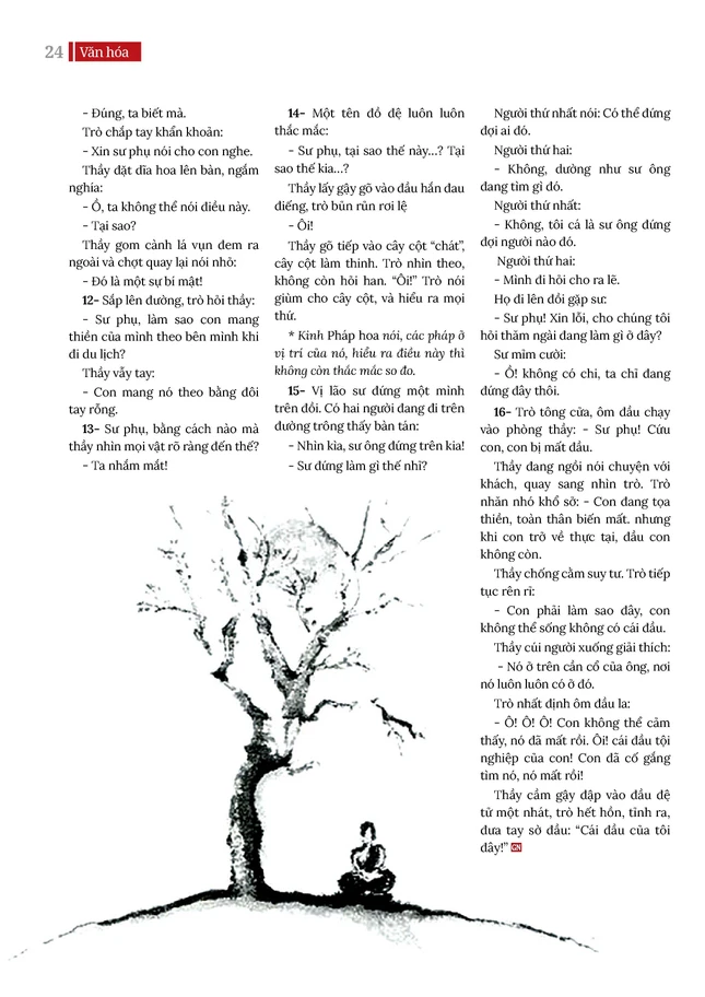 Thầy đang ngồi nói chuyện với khách, quay sang nhìn trò. Trò nhăn nhó khổ sở: - Con đang tọa thiền, toàn thân biến mất. nhưng khi con trở về thực tại, đầu con không còn.