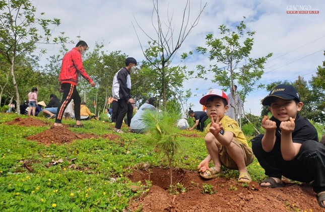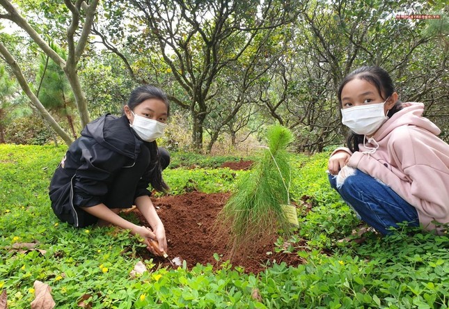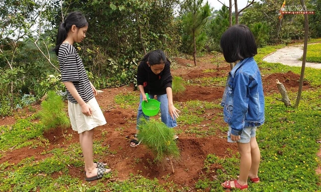 Trong khi các em trồng cây, lẫn trong những rộn rã tiếng cười, còn vang lên lời thơ: