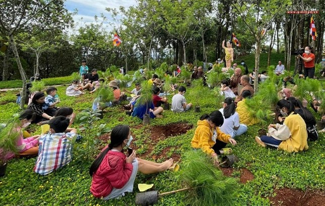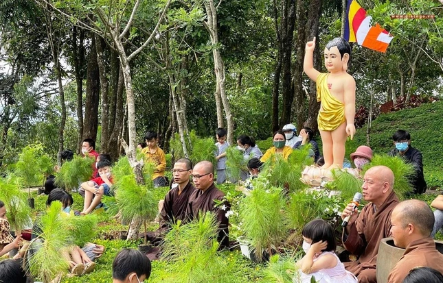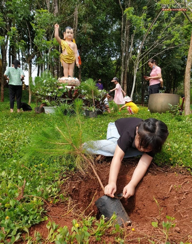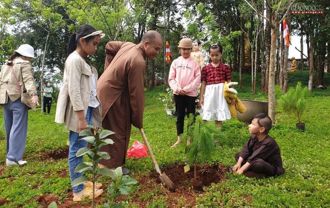 Hơn 100 em thiếu nhi tham gia trồng cây thông trong vườn chùa, trên mỗi cây được gắn tên người trồng. Đại đức trụ trì Thích Quảng Mẫn cùng quý Thầy tham dự chia sẻ đôi lời nhắn nhủ các em siêng năng đến chùa để lễ Phật, chăm cây để cải thiện môi trường và phát nguyện là con ngoan trò giỏi.