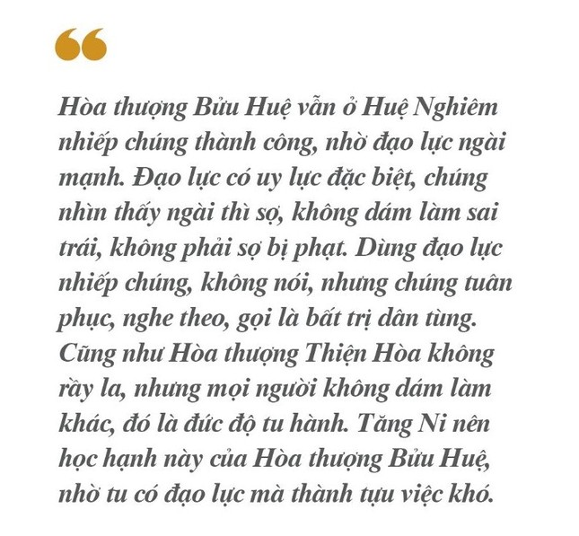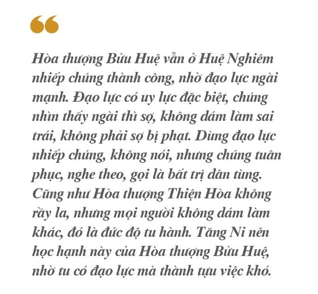 Cũng như Hòa thượng Thiện Hòa không rầy la, nhưng mọi người không dám làm khác, đó là đức độ tu hành. Tăng Ni nên học hạnh này của Hòa thượng Bửu Huệ, nhờ tu có đạo lực mà thành tựu việc khó. Ngài đào tạo được lớp học trò giỏi như Hòa thượng Thiện Nhơn, Hòa thượng Minh Thông...