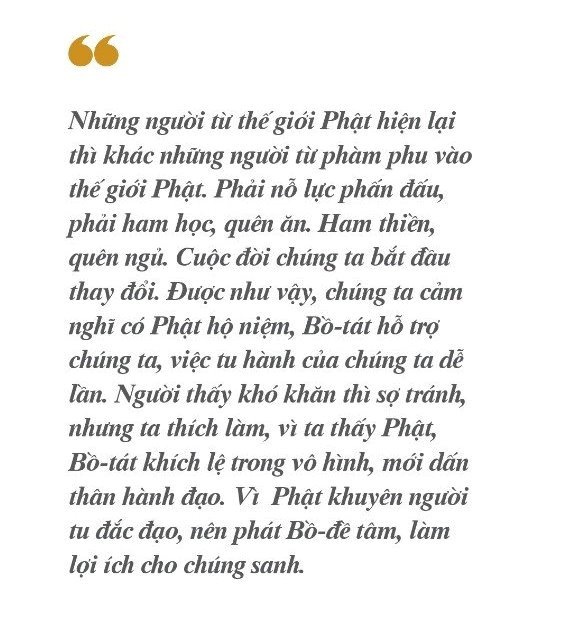 Những người từ thế giới Phật hiện lại thì khác những người từ phàm phu vào thế giới Phật. Phải nỗ lực phấn đấu, phải ham học, quên ăn. Ham thiền, quên ngủ. Cuộc đời chúng ta bắt đầu thay đổi. Được như vậy, chúng ta cảm nghĩ có Phật hộ niệm, Bồ-tát hỗ trợ chúng ta, việc tu hành của chúng ta dễ lần. Người thấy khó khăn thì sợ tránh, nhưng ta thích làm, vì ta thấy Phật, Bồ-tát khích lệ trong vô hình, mới dấn thân hành đạo. Vì Phật khuyên người tu đắc đạo, nên phát Bồ-đề tâm, làm lợi ích cho chúng sanh. Chính vì vậy, kinh Vô lượng nghĩa nói điều thứ nhất của người tu là phải có đạo đức, thứ hai phải có trí tuệ và thứ ba, làm lợi ích cho nhiều người. Làm đúng ba điều này, chúng ta được Phật hộ niệm.