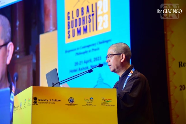 "Thời gian qua, chúng ta đã chứng kiến sự hủy diệt tàn khốc của đại dịch Covid-19; thêm vào đó là chiến tranh kinh hoàng ở một vài quốc gia; sự biến đổi khí hậu khiến thế giới hứng chịu nhiều thảm họa thiên tai, gây tử vong cho biết bao sinh mạng quý giá, đời sống bị xáo trộn, nhiều mất mát đau thương cho nhân loại… Hận thù và tham lam đã làm cho nhân loại vốn khổ đau lại càng đau khổ. Hôm nay, ở đây, trên quê hương của Đức Thích Ca Mâu Ni muôn đời tôn kính, là những người đệ tử Phật, chúng ta cùng nhau thảo luận, tìm ra phương hướng giúp nhân loại sống hòa bình, an lạc, hạnh phúc như Ngài thường dạy: 'Vì hạnh phúc, vì an lạc cho chư Thiên và loài người'", Đức Pháp chủ chia sẻ trong thông điệp của mình trước đại biểu của hơn 30 quốc gia và vùng lãnh thổ tham dự Hội nghị Thượng đỉnh Phật giáo Toàn cầu năm 2023.