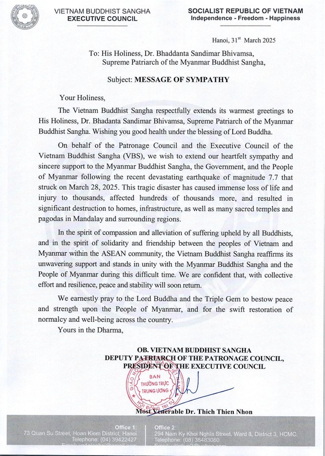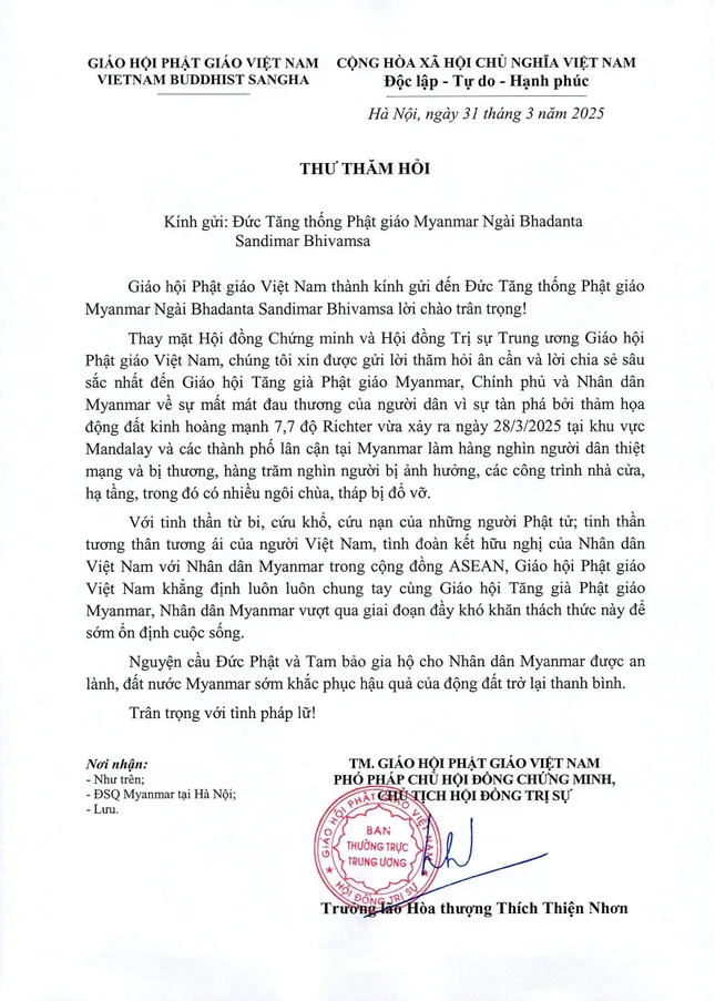 GNO - Hôm nay, 31-3, Trưởng lão Hòa thượng Thích Thiện Nhơn, Phó Pháp chủ Hội đồng Chứng minh, Chủ tịch Hội đồng Trị sự thay mặt GHPGVN có thư thăm hỏi và gửi lời chia sẻ sâu sắc nhất đến Giáo hội Tăng-già Phật giáo Myanmar, Chính phủ và nhân dân Myanmar về sự mất mát đau thương bởi trận động đất ngày 28-3.