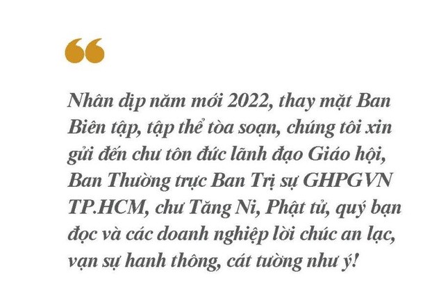 Nhân dịp năm mới 2022, thay mặt Ban Biên tập, tập thể tòa soạn, qua ấn phẩm cuối năm 2021 này, chúng tôi xin gửi đến chư tôn đức lãnh đạo Giáo hội, Ban Thường trực Ban Trị sự GHPGVN TP.HCM, chư Tăng Ni, Phật tử, quý bạn đọc và các doanh nghiệp lời chúc an lạc, vạn sự hanh thông, cát tường như ý!