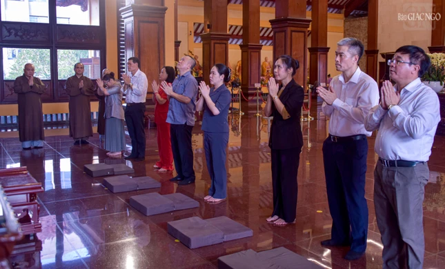 GNO - Nhân chuyến công tác tại TP.HCM, bà Nông Thị Hà, Thứ trưởng Bộ Dân tộc và Tôn giáo, cùng các thành viên đoàn đã đến Việt Nam Quốc Tự thăm, chúc sức khỏe lãnh đạo Ban Trị sự GHPGVN TP.HCM, dâng hương lễ Phật và chiêm bái xá-lợi Trái tim Bồ-tát Thích Quảng Đức, vào chiều 13-4.