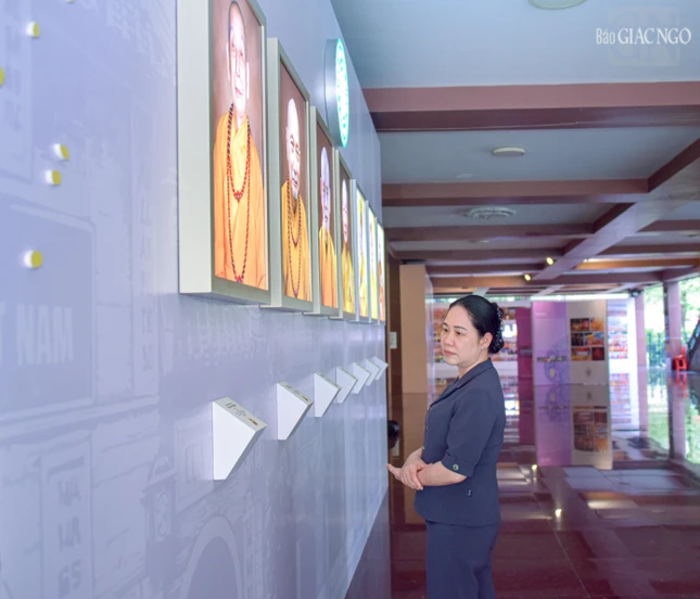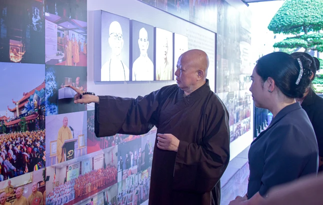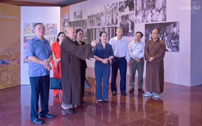 | Thượng tọa Thích Tâm Hải, Ủy viên Hội đồng Trị sự, Tổng Biên tập Báo Giác Ngộ giới thiệu không gian triển lãm "45 năm Giáo hội Phật giáo Việt Nam: Phát triển cùng đất nước - Bước vào kỷ nguyên mới" đến các thành viên trong đoàn |