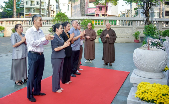 Hòa thượng Thích Lệ Trang, Phó Chủ tịch Hội đồng Trị sự, Trưởng ban Nghi lễ T.Ư, Trưởng ban Trị sự GHPGVN TP.HCM, cùng các thành viên trong Ban Trị sự Phật giáo thành phố thân mật đón tiếp phái đoàn.