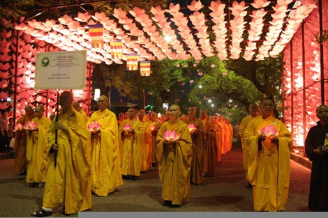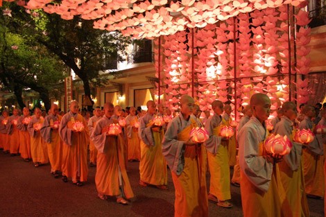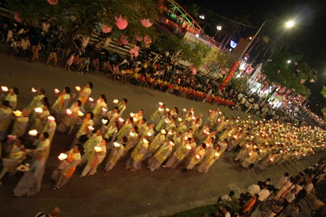 Đoàn rước Phật đi từ chùa Diệu Đế lên chùa Từ Đàm, lộ trình ước chừng 4km, với hàng vạn người tham dự, trên mình mặc y phục chỉnh tề có in logo Đại lễ Phật đản LHQ 2008 tại Huế, trên tay có cầm lồng đèn nến được thắp sáng, đã tạo thành một dòng ánh sáng lung linh huyền ảo dài vô tận.