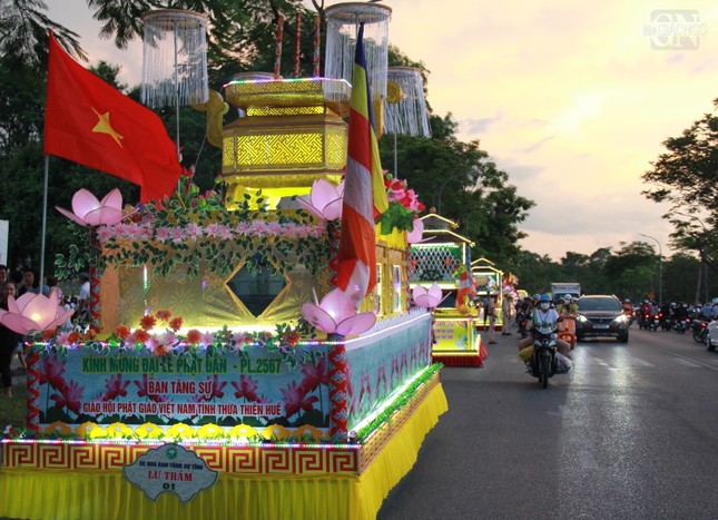 GNO - Tối 13-4-Quý Mão (31-5-2023), tại Nghinh Lương Đình, Ban Tổ chức Đại lễ Phật đản Phật lịch 2567 tại Thừa Thiên Huế đã khai mạc diễu hành 32 chiếc xe hoa và văn nghệ cúng dường mừng ngày Khánh đản của Đức Phật.