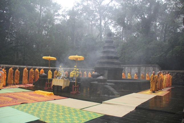 Từ sáng sớm, trong tiết trời mưa lạnh, Tăng Ni, Phật tử tại cố đô đã có mặt tại núi Thiên Thai, nơi tọa lạc bảo tháp Tổ sư Liễu Quán cùng phát quang cỏ dại, tảo tháp.
