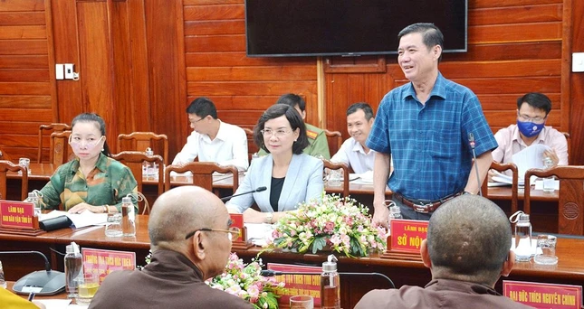 Thượng tọa Thích Đức Thiện thông tin về kế hoạch tổ chức Đại hội Phật giáo tỉnh tại buổi làm việc - Ảnh: Báo Bình Phước |