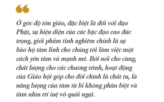 Điều tôi thấy thật may mắn là trong tất cả các Phật sự luôn có sự hiện diện trực tiếp hoặc gián tiếp của chư tôn Trưởng lão, các bậc giáo phẩm của các truyền thống, hệ phái trong ngôi nhà Phật giáo Việt Nam. Ở góc độ tôn giáo, đặc biệt là đối với đạo Phật, sự hiện diện của các bậc đạo cao đức trọng, giới phẩm tinh nghiêm chính là sự bảo hộ tâm linh cho chúng tôi làm việc một cách yên tâm và mạnh mẽ. Bởi nói cho cùng, chất lượng cho các chương trình, hoạt động của Giáo hội góp cho đời chính là chất tu, là năng lượng của tâm từ bi không phân biệt và tầm nhìn trí tuệ vô quải ngại. Đó cũng là điều mà chúng ta thấy được qua đại dịch Covid-19, thể hiện một cách sinh động trong và sau đợt bùng phát khốc liệt nhất không chỉ cho TP.HCM mà ảnh hưởng lên cả nước, và chính trong hoàn cảnh thực tại đó, chúng ta thấy rõ nhất sức mạnh của tình thương yêu, đùm bọc lẫn nhau thật cảm động của người Việt. Đó cũng chính là sức mạnh lớn để Việt Nam vươn lên mỗi khi gặp hoàn cảnh khó khăn và trở nên hùng cường.