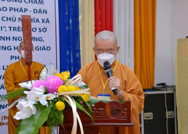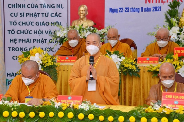 Phát biểu chỉ đạo, Hòa thượng Thích Như Tín bày tỏ sự nhất trí với báo cáo tổng kết Phật sự khóa IX, phương hướng hoạt động cho nhiệm kỳ 2021-2026, đồng thời biểu dương tinh thần đoàn kết trong các công tác Phật sự, đặc biệt là từ thiện xã hội của Phật giáo huyện nhà dưới sự dẫn dắt của Hòa thượng Thích Thiện Lạc.