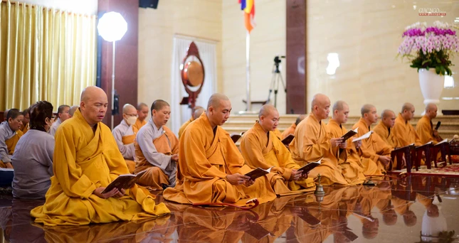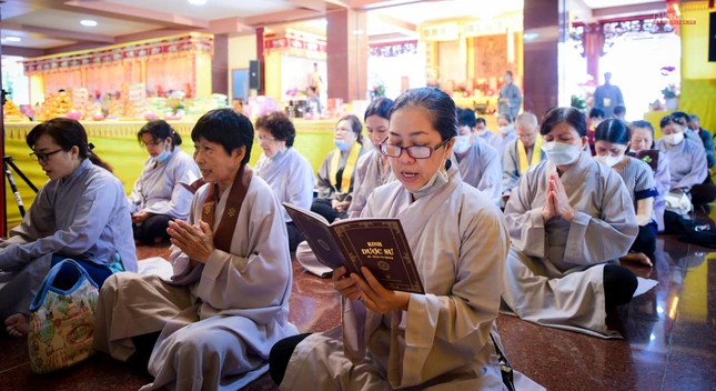 Sáng nay, tại Đại lễ kỳ siêu, pháp hội trì tụng kinh Dược Sư cũng trang nghiêm diễn ra với sự tham dự của chư tôn đức Ban Trị sự GHPGVN TP.HCM, chư Tăng Ni và Phật tử các cơ sở tự viện thuộc GHPGVN quận: 12, Bình Tân; các huyện: Hóc Môn, Bình Chánh, Củ Chi, Nhà Bè, Cần Giờ tham gia trì tụng kinh Dược sư hiệp lực đem năng lượng cầu nguyện, lan tỏa năng lượng an lành đến pháp giới chúng sanh hiện hữu và chư hương linh đã quá vãng.
