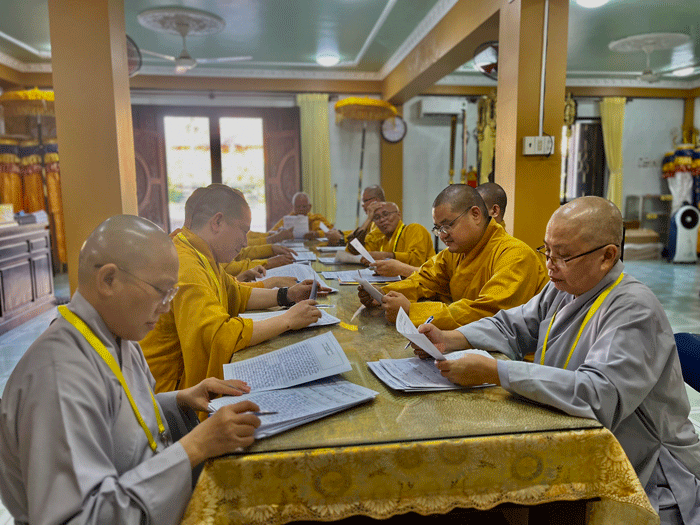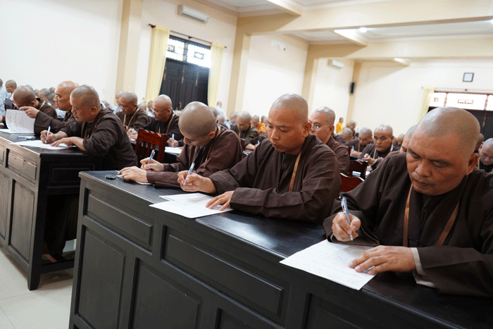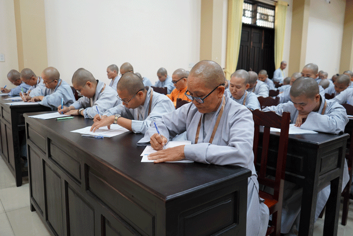 Giới tử thực hiện khảo thí trong Đại giới đàn lần này bằng hai hình thức: Trả lời câu hỏi trực tiếp từ chư tôn đức trong Ban Giám khảo và viết bài luận ngắn.