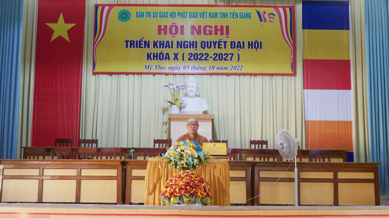 Tại buổi triển khai, chưa tôn đức đã lắng nghe lại toàn văn Nghị quyết Đại hội Phật giáo tỉnh Tiền Giang nhiệm kỳ X tổ chức vào hai ngày 28 và 29-6-2022, tại chùa Vĩnh Tràng với gần 300 đại biểu tham dự. Đại hội đã thống nhất thông qua bản nghị quyết với 7 điểm như sau: Thông qua báo cáo tổng kết công tác Phật sự nhiệm kỳ IX và phương hướng hoạt động Phật sự nhiệm kỳ X (2022-2027); Suy tôn 7 vị Hòa thượng vào Ban Chứng minh Ban Trị sự GHPGVN tỉnh Tiền Giang nhiệm kỳ X; Suy cử Ban Trị sự GHPGVN tỉnh Tiền Giang nhiệm kỳ X là 61 vị, trong đó 25 vị là Ủy viên Thường trực và 36 Ủy viên, do Thượng tọa Thích Quảng Lộc đảm nhận chức vụ Trưởng ban Trị sự kiêm Tăng sự; Đại hội tiếp thu ý kiến phát biểu của ông Võ Văn Bình, Phó Bí thư Thường trực Tỉnh ủy, Chủ tịch HĐND tỉnh Tiền Giang; Y giáo phụng hành lời chỉ đạo của Hòa thượng Thích Thiện Nhơn - Chủ tịch Hội đồng Trị sự GHPGVN; Ghi nhận các ý kiến đóng góp xây dựng phương hướng hoạt động Phật sự của Ban Trị sự GHPGVN tỉnh nhiệm kỳ X và các tham luận của các đại biểu; Giao trách nhiệm cho Ban Thư ký tổng hợp các ý kiến của các đại biểu, bổ sung vào phương hướng hoạt động Phật sự nhiệm kỳ X đã được thông qua tại đại hội.