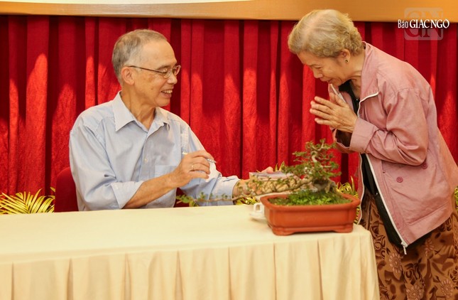 | Thượng tọa Thích Tâm Hải tặng hoa tri ân Tiến sĩ Nguyễn Tường Bách cùng phu nhân Đỗ Thị Vinh |