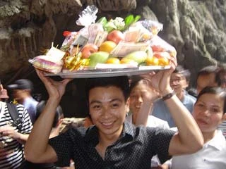 Vào cửa Phật mà phải cãi cọ, giành nhau đi đò, đi cáp treo. Thật phiền, nhưng chưa đến nỗi phải giẫm đạp lên nhau như những cuộc hành hương tôn giáo nổi tiếng trên thế giới. Tôi đứng nhìn cái sự tranh giành, đến hơn nửa tiếng đồng hồ mới có đò để đi. Nhớ lời mẹ nói “một vái xa bằng ba vái gần”, tôi đứng từ xa vái Phật nhưng vẫn vui vì thấy Phật như ở ngay cạnh mình. Đang niệm Phật, đang nhớ tới lời của mẹ thế mà tôi lại “mộng mị” đến câu hát giao duyên “Yêu nhau đứng ở đằng xa, Con mắt liếc lại bằng ba đứng gần.” Chỉ do cái tội gần 30 rồi mà chưa ưng ai. Tôi liếc nhìn một cô gái tuổi trăng tròn. Cái đẹp tỏa ra từ đôi má, từ ánh mắt trong veo, từ những ngón tay búp măng trắng hồng nhỏ xinh, từ sự vụng về đáng yêu khi mang lễ. Vái niệm xong mà cô gái cứ nhìn người chung quanh tủm tỉm, ngượng nghịu. Cái duyên nơi cửa Phật và cái duyên tình. Tôi không biết mấy cô cậu trai trẻ nam mô để làm gì, nhưng trong tiếng nam mô có ngụ vài ý “lá thắm chỉ hồng” ấy cũng làm dòng Yến trở nên sóng sánh hơn, lay động hơn. Và trong đêm nay, giữa cõi linh thiêng, sau một ngày gửi lòng thành nơi những bước chân, rất có thể người con gái tuổi trăng tròn ngủ say mà miệng vẫn tủm tỉm: Nam Mô A Di Đà…