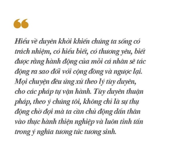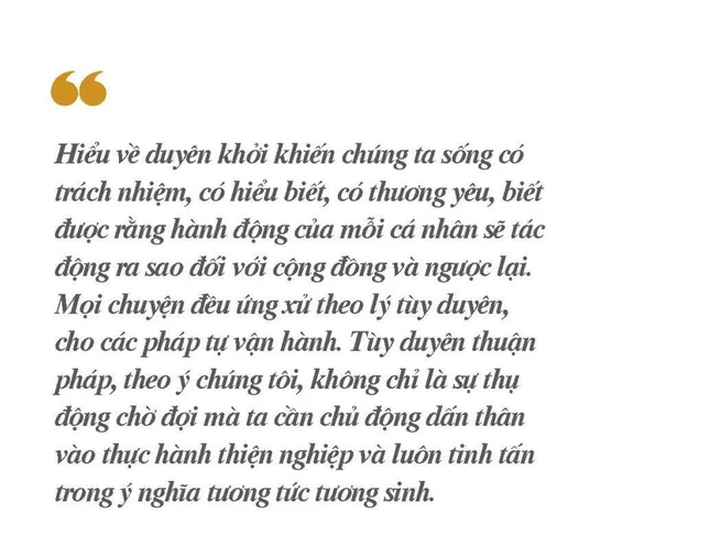 Hiểu về duyên khởi khiến chúng ta sống có trách nhiệm, có hiểu biết, có thương yêu, biết được rằng hành động của mỗi cá nhân sẽ tác động ra sao đối với cộng đồng và ngược lại. Mọi chuyện đều ứng xử theo lý tùy duyên, cho các pháp tự vận hành. Tùy duyên thuận pháp, theo ý chúng tôi, không chỉ là sự thụ động chờ đợi mà ta cần chủ động dấn thân vào thực hành thiện nghiệp theo “Tứ chánh cần” và “Bát chánh đạo”, và luôn tinh tấn trong ý nghĩa tương tức tương sinh.