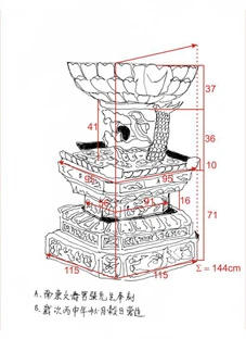 2. Phần bệ tượng, tính từ mặt đài sen đến hết chân bệ-144cm. Đài sen chỗ rộng nhất chu vi là 331cm, chu vi đế đài sen là 175cm.