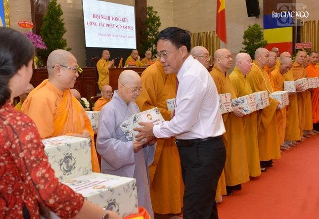 Dịp này, Ủy ban MTTQVN TP.HCM tặng quà chúc mừng đến chư tôn đức TP.HCM được suy tôn vào Hội đồng Chứng minh, suy cử Hội đồng Trị sự tại Đại hội lần IX GHPGVN.