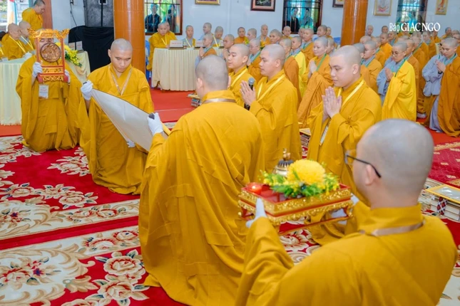 Tại lễ khai mạc, toàn thể giới tử đã trang nghiêm lắng nghe đạo từ của Trưởng lão Hòa thượng Chủ tịch Hội đồng Trị sự nêu ý nghĩa của việc giữ giới luật trong suốt đời tu của người xuất gia.