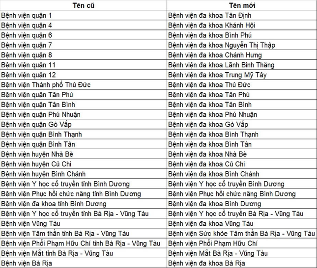 Danh sách 26 bệnh viện đổi tên cụ thể như sau: