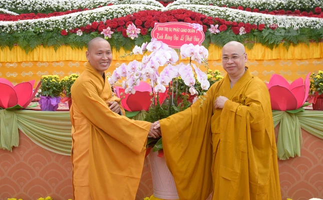 Nhằm thể hiện lòng tôn kính dâng lên cúng dường Đức Thế Tôn nhân ngày đản sinh của Ngài, chư tôn giáo phẩm đã thành kính dâng hương, đồng tụng sám Khánh đản trước lễ đài Quan Âm tu viện.
