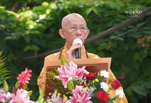 Để ôn lại những đóng góp của Bồ-tát Thích Quảng Đức trong dòng chảy của lịch sử, Trưởng lão Hòa thượng Thích Huệ Minh đã cung tuyên tiểu sử của Bồ-tát đến với Tăng Ni, Phật tử, đại diện chính quyền tham dự.