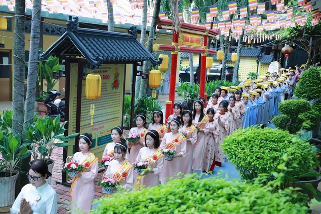 Bên cạnh đó, Ni sư cũng chia sẻ thêm: “Dâng pháp y không chỉ là nghi thức truyền thống, mà còn là lời phát nguyện nuôi lớn hạnh tu, giữ vững chí nguyện ban đầu, để mãi là sứ giả Như Lai, đem ánh sáng Phật pháp lan tỏa khắp muôn nơi. Trong không khí Vu lan thắng hội, được trang nghiêm cài hoa hồng trên ngực áo càng làm sâu dày thêm ý nghĩa hiếu đạo”.